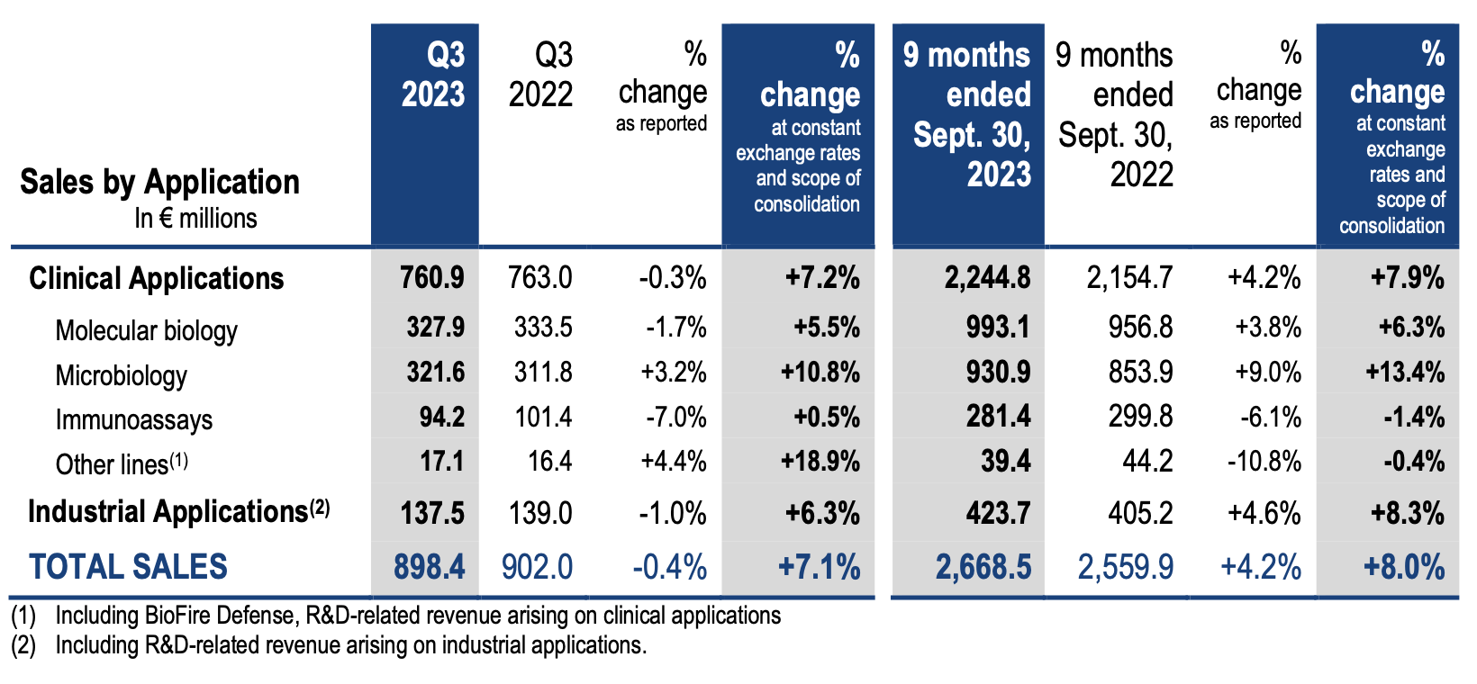- Sales in the Europe – Middle East – Africa region (32% of the consolidated total) came to 293 million for the 2023 third-quarter, up nearly 10% year-on-year driven by a double-digit growth in microbiology key ranges, BIOFIRE® panels (both respiratory and non-respiratory) and Industrial Applications.