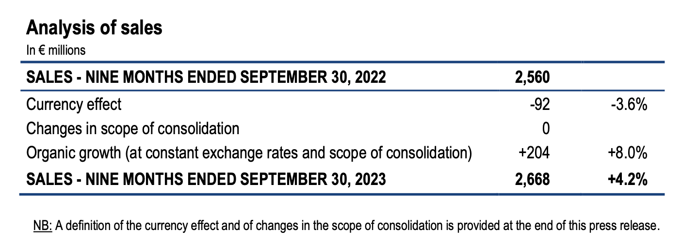Consolidated sales amounted to 2,668 million for the first nine months of 2023 versus 2,560 million for the prior-year period, representing a growth of +4.2% as reported. Organic growth (at constant exchange rates and scope of consolidation) reached +8.0% for the first nine months of the year. Changes in exchange rates had a negative 92 million impact over 9 months, due to the appreciation of the euro against most of the other currencies and mainly the US dollar, the Chinese yuan and the Argentinian peso.