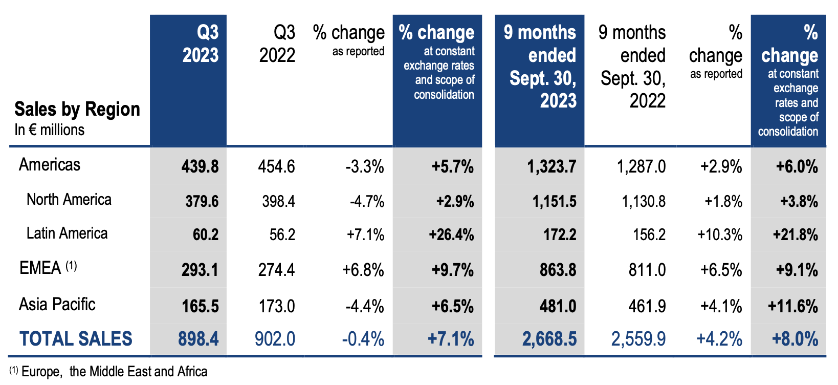 - Sales in the Americas (50% of the consolidated total) reached 440 million in third-quarter 2023, an increase of nearly 6% on third-quarter 2022.