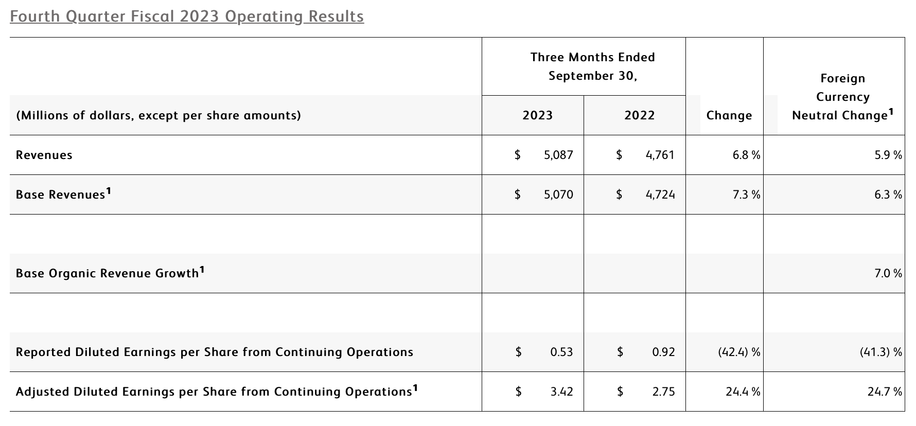 - FY23 revenue from base business grew 5.1% as reported, 7.0% currency-neutral or 5.8% organic