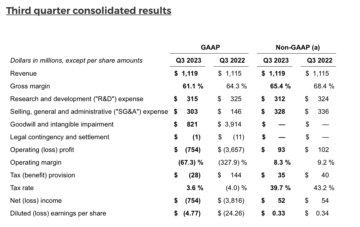 - Revenue of $1.12 billion for Q3 2023, flat compared to Q3 2022 (up 1% on a constant currency basis) and down 5% from Q2 2023