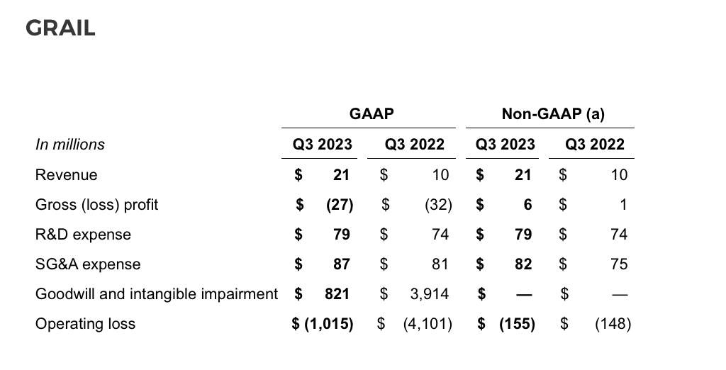 - GAAP diluted loss per share of $(4.77) for Q3 2023, which included goodwill and intangible impairments of $821 million related to the GRAIL segment, compared to GAAP diluted loss per share of $(24.26) for Q3 2022, which included goodwill impairment of $3.91 billion related to the GRAIL segment