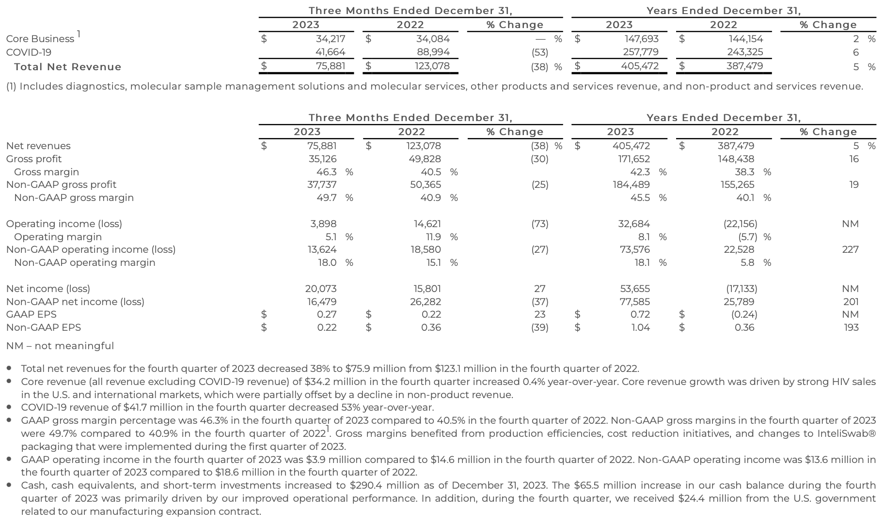 “We made meaningful progress on our transformation journey in 2023. We generated significant positive operating cash flow with margin expansion, driven by our enterprise-wide focus on innovating and operating with disciplined execution. We expect to deliver additional productivity gains across our organization, and we are on track to achieve our target of break-even in cash flow from operations for the core business by the end of 2024,” said OraSure President and CEO Carrie Eglinton Manner.