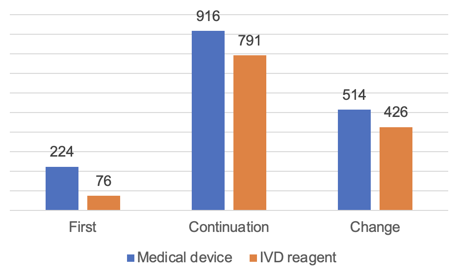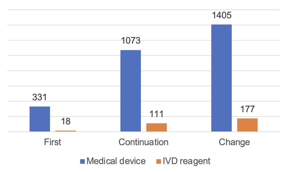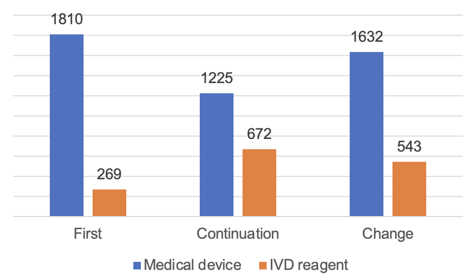 According to the registered species, 9,130 medical devices, accounting for 74.8% of all medical device registrations; 3,083 in vitro diagnostic reagents, accounting for 25.2%. According to the form of registration, 2,728 items of first registration, accounting for 22.3% of all medical device registrations; 4,788 items of continuation registration, accounting for 39.2%; change of registration application 4,697, accounting for 38.5%.
