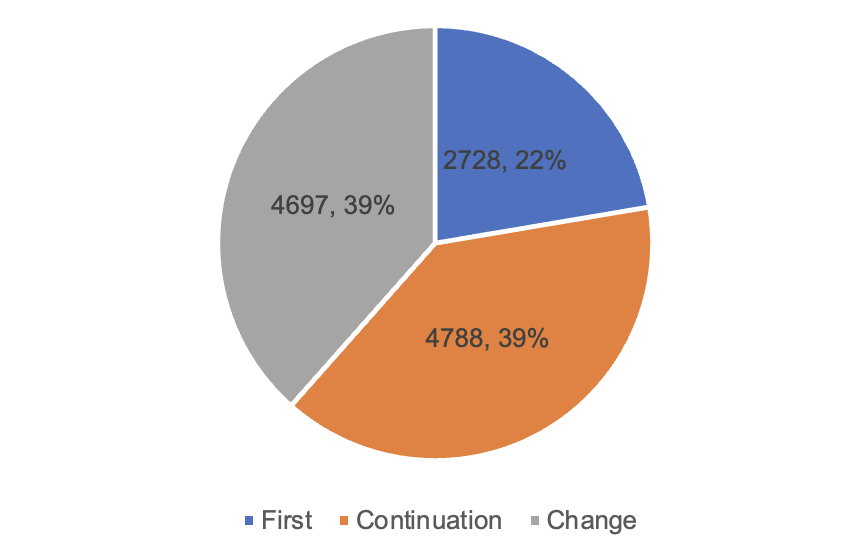 From the registration form, the first registration of 349, accounting for 11.2%; continuation of 1,184, accounting for 38%; change registration of 1,582, accounting for 50.8%.
