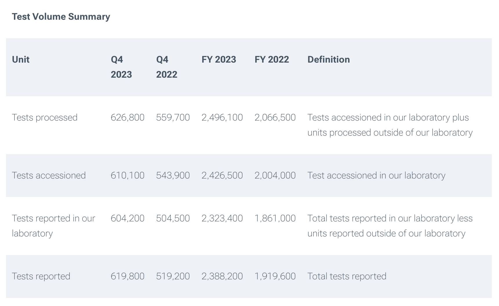· Processed approximately 2,496,100 tests in the full year 2023, compared to approximately 2,066,500 tests in 2022, an increase of 20.8%.