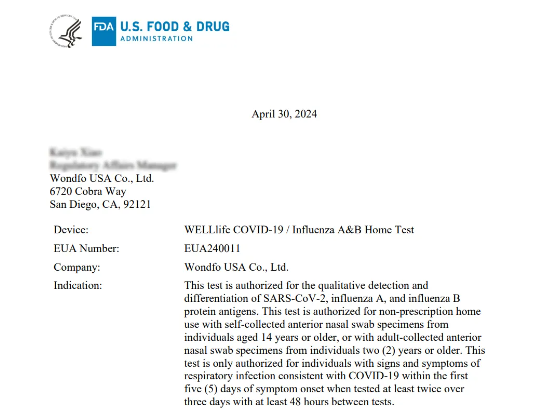 Recently, Wondfo USA Co., Ltd, a wholly owned subsidiary of Wondfo, received notification from the U.S. Food and Drug Administration (FDA) that the Wondfo USA's WELLlife™ COVID-19 / Influenza A&B Home Test for the SARS-COV-2 viruses, influenza A virus, and influenza B virus, has obtained Emergency Use Authorization from FDA (EUA240011).
