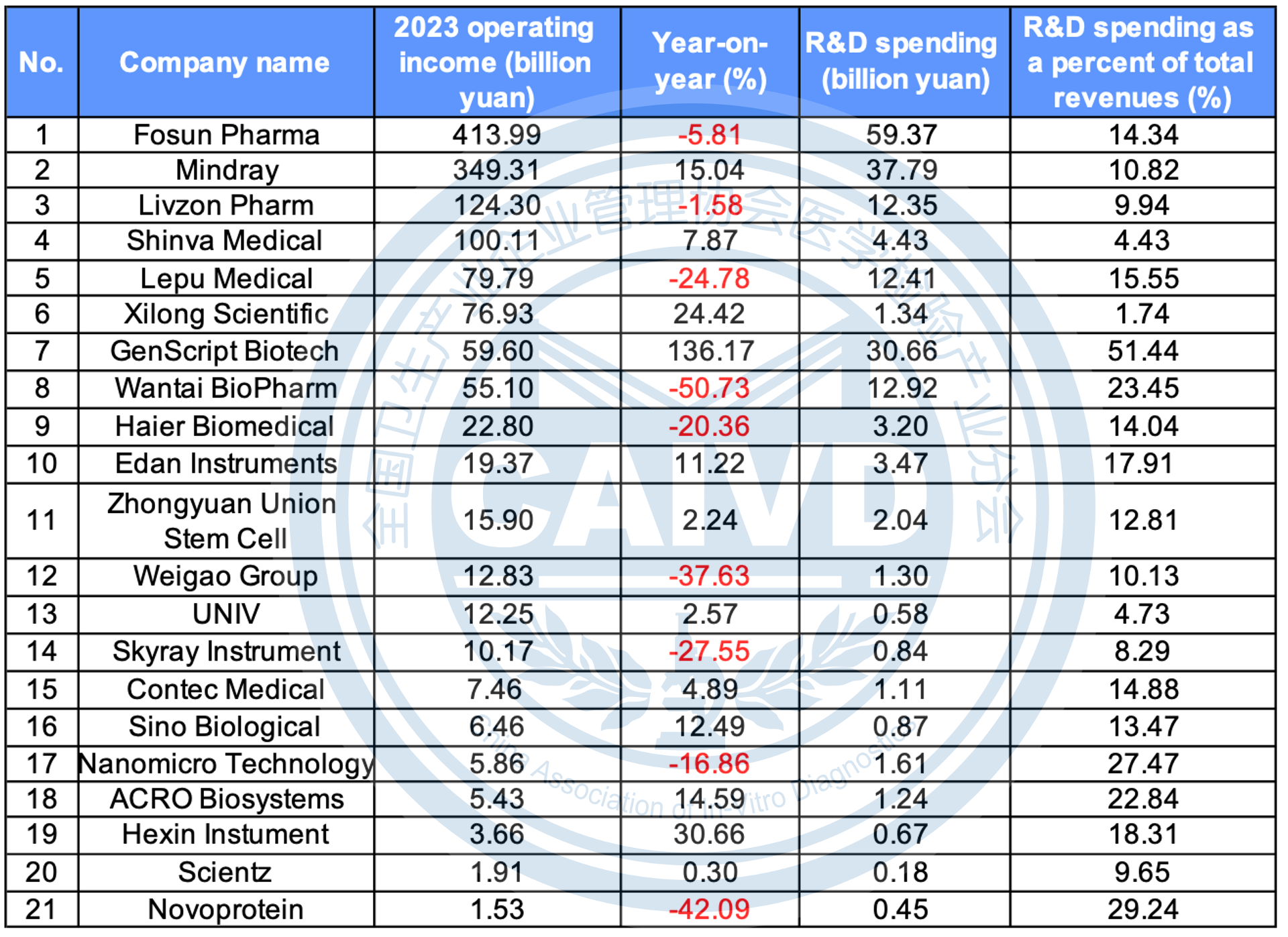 Table 2 The total operating revenue and R&D spending of companies with IVD-related business in 2023