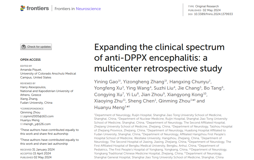 Recently, the results of a multi-center study on anti-DPPX encephalitis in China, in which Dian Diagnostics participated, were published in the international journal Frontiers in Neuroscience, summarizing information on the clinical manifestations, imaging and pathogenic factors, and therapeutic means of the disease. The results summarize the clinical manifestations, imaging examinations, pathogenic factors, and treatment methods of the disease, and provide new perspectives for the diagnosis and treatment of anti-DPPX encephalitis in the future.