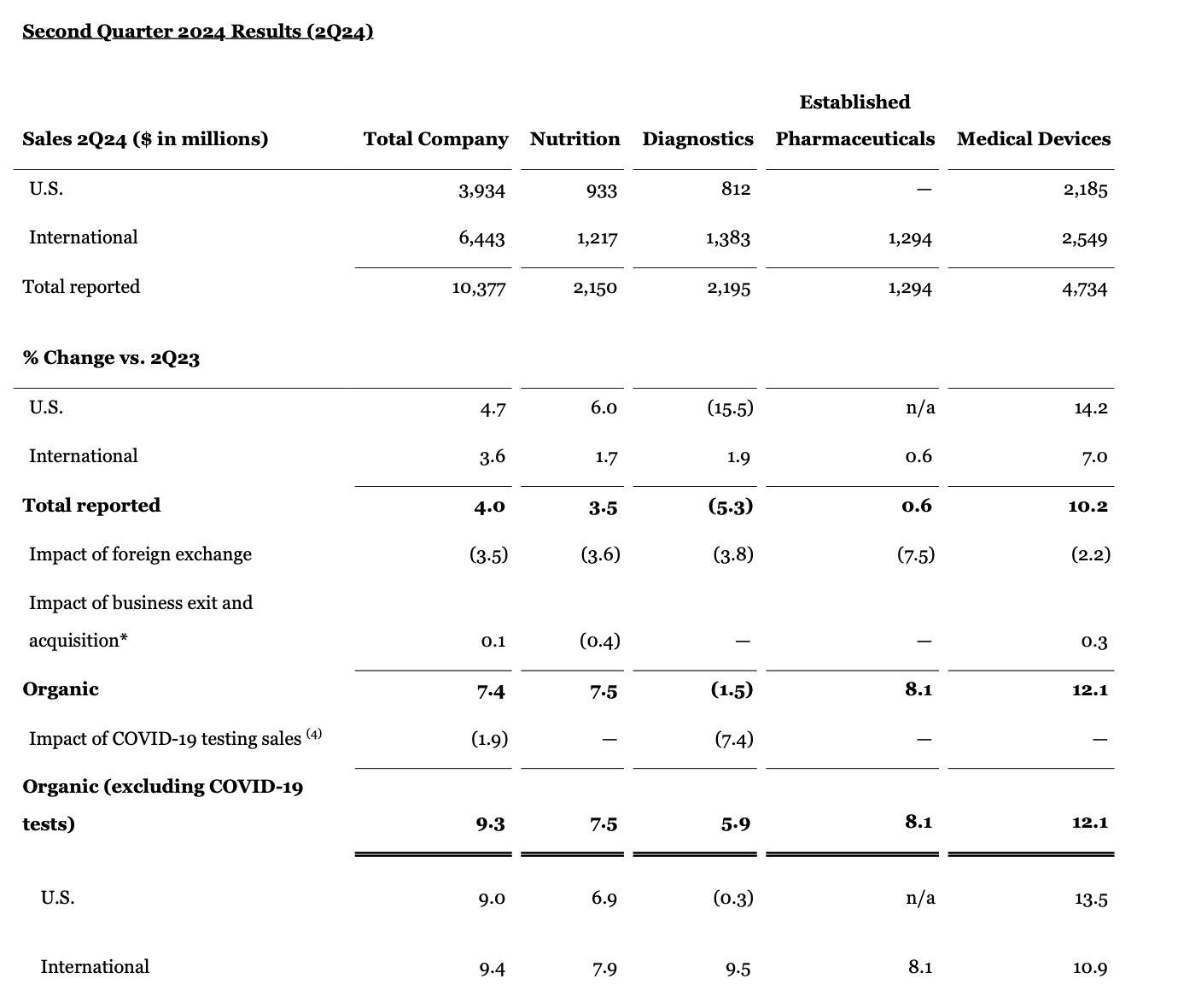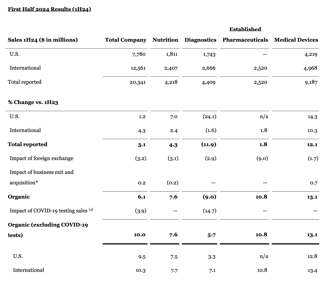 - Abbott narrowed its full-year 2024 organic sales growth guidance range, excluding COVID-19 testing-related sales, to 9.5% to 10.0%, which represents an increase at the midpoint of the range2.