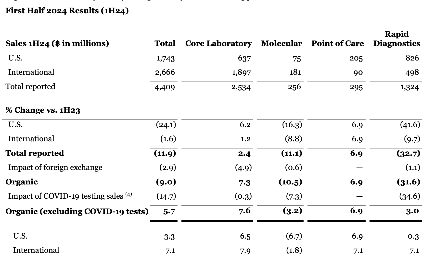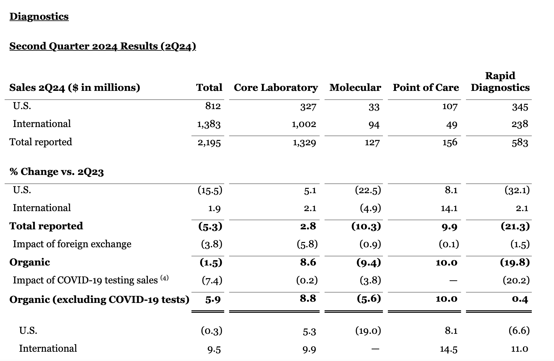 As expected, Diagnostics sales growth in the second quarter was negatively impacted by year-over-year declines in COVID-19 testing-related sales4. Worldwide COVID-19 testing sales were $102 million in the second quarter of 2024 compared to $263 million in the second quarter of the prior year.