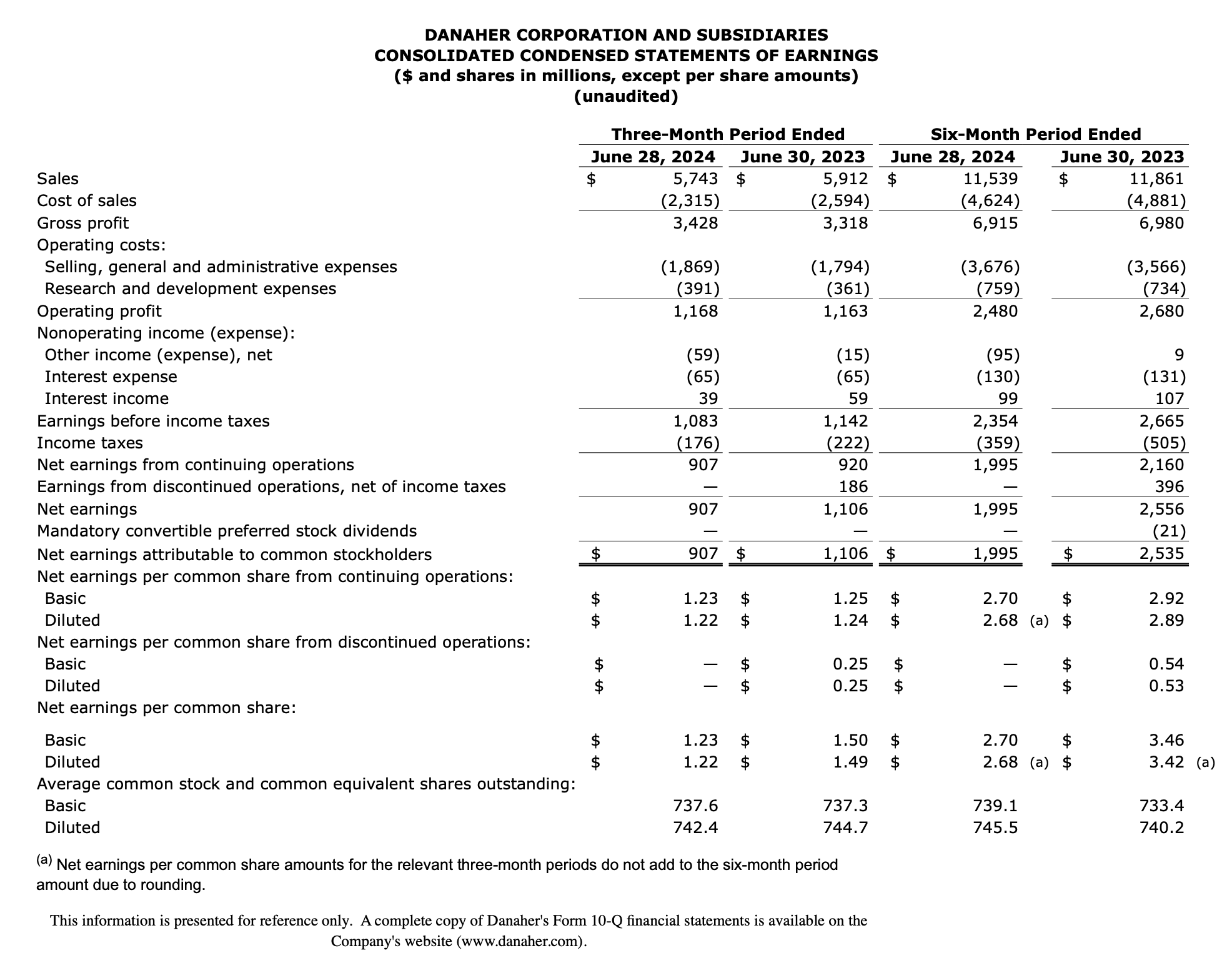 Danaher Corporation (NYSE: DHR) (the "Company") today announced results for the quarter ended June 28, 2024. All results in this release reflect only continuing operations unless otherwise noted.