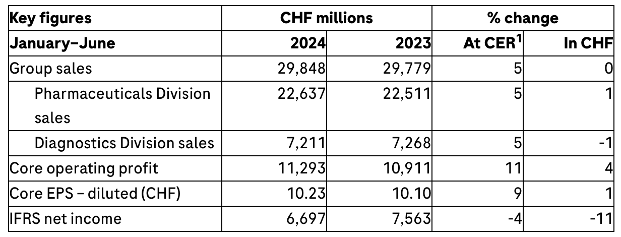 The Pharmaceuticals Division base business grew by 8%, while divisional sales increased by 5% to CHF 22.6 billion, driven primarily by higher sales of Vabysmo (severe eye diseases), with growing demand for Phesgo (breast cancer), Ocrevus (multiple sclerosis), Polivy (blood cancer) and Evrysdi (spinal muscular atrophy). These five medicines together generated total sales of CHF 7.3 billion, an increase of CHF 1.8 billion (CER) from the first half of 2023.