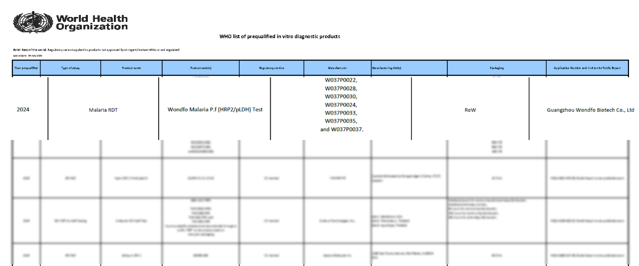 Wondfo Biotech announced that recently, the company received a letter of confirmation of in vitro diagnostic prequalification (PQ) from the World Health Organization (WHO), and was informed that the company's malaria test product has passed the prequalification of the World Health Organization (WHO), and has been included in the Recommended Procurement List of In Vitro Diagnostic Products by WHO. The name of the product is Wondfo Malaria P.f (HRP2/pLDH) Test, which is used for the qualitative detection of Plasmodium falciparum-specific histidine-rich protein-2 (P.fHRP2) and Plasmodium falciparum-specific lactate dehydrogenase (P.fpLDH) in human finger and venous whole blood. This product is used as an aid in the diagnosis of Plasmodium falciparum malaria infection in symptomatic patients, including pediatric testing. It is intended for use by healthcare professionals for in vitro diagnostic purposes only.