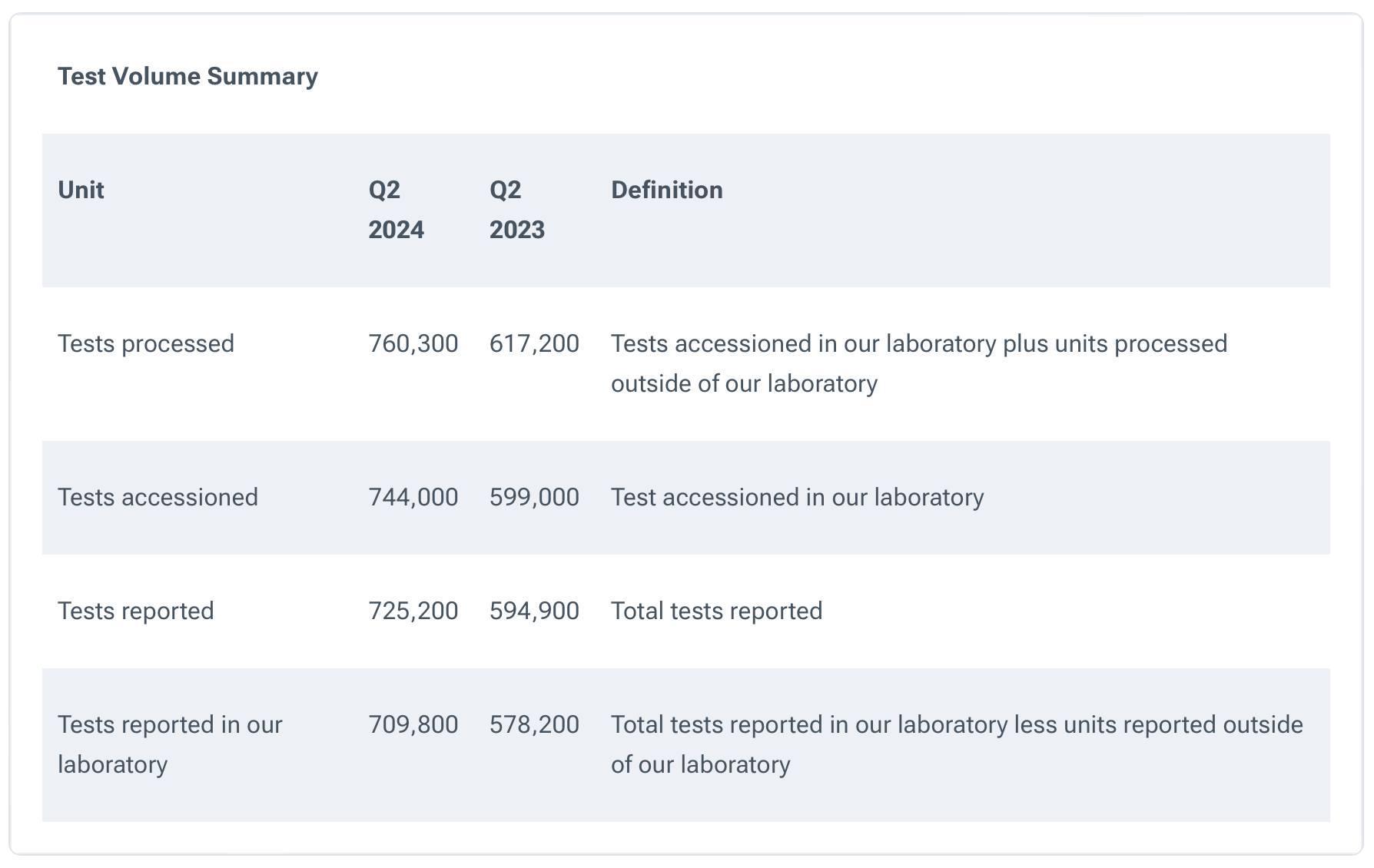 · Processed approximately 760,300 tests in the second quarter of 2024, compared to approximately 617,200 tests in the second quarter of 2023, an increase of 23.2%.