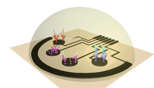 An artist's rendering showing how the sensor contains areas that each detect a different indicator of a COVID-19 infection. Credit: Caltech