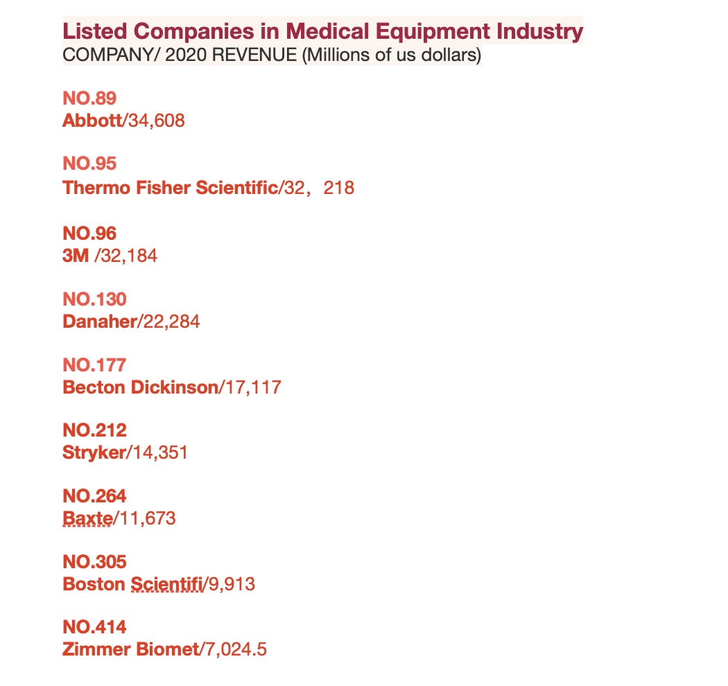 Nine companies in the medical equipment industry are on the list, and 5 companies involved in IVD business were also on the list --- Abbott, Thermo Fisher, Danaher, BD, and 3M.